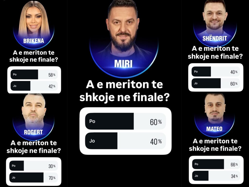 Në televotim për finalistë këtë herë janë Brikena, Miri, Shëndrit, Rogert dhe Mateo. Të gjithë ata po luftojnë për një vend në natën më të rëndësishme të këtij edicioni, ndërsa votat dhe reagimet në rrjete sociale kanë nisur të krijojnë një panoramë më të qartë.
